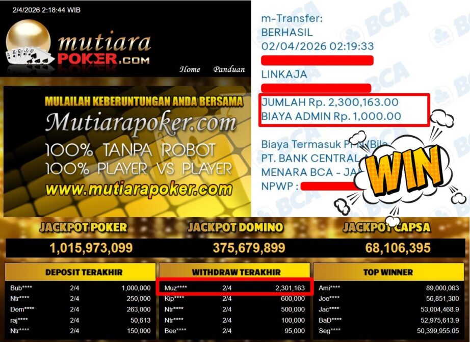 Bukti Withdraw ( 2.301.163,-) Member Setia Mutiarapoker